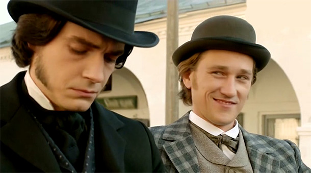 Википедия утверждает, что после 2014 года ничего нового не снимали, а я начала как раз с сериала, вышедшего в этом году. Версия Хотиненко не является буквальным переносом текста на экран, повествование выстроено через персонажа, которого в оригинале нет. В принципе, это неплохо, потому что определенным образом структурирует происходящее, да и творческий подход, не подразумевающий искажение авторского замысла, всегда радует. Из нововведений здесь также хобби Ставрогина — коллекционирование бабочек. По-моему, отлично подходит Николаю Всеволодовичу, который будто бы коллекционирует некогда прекрасные, а ныне отравленные им души. (Кстати, лично мне вообще как-то неприятно это собирательство красивых трупов). О бабочках Ставрогин говорит с Дашей, и в процессе их диалога рисуется параллель Николай — само насекомое: его внешняя броская красота скрывает мерзость. Есть сцена с бабочкой в банке, и тут снова кажется, что это отображение Ставрогина, который находится в некой невидимой ловушке, мечется, не знает, как выбраться из той жизненной ситуации, в которой оказался по своей вине. Впрочем, режиссер в какой-то программе сказал, что бабочки символизируют гордыню, и этого я не поняла. Ну, раз сказал, значит так и есть.
